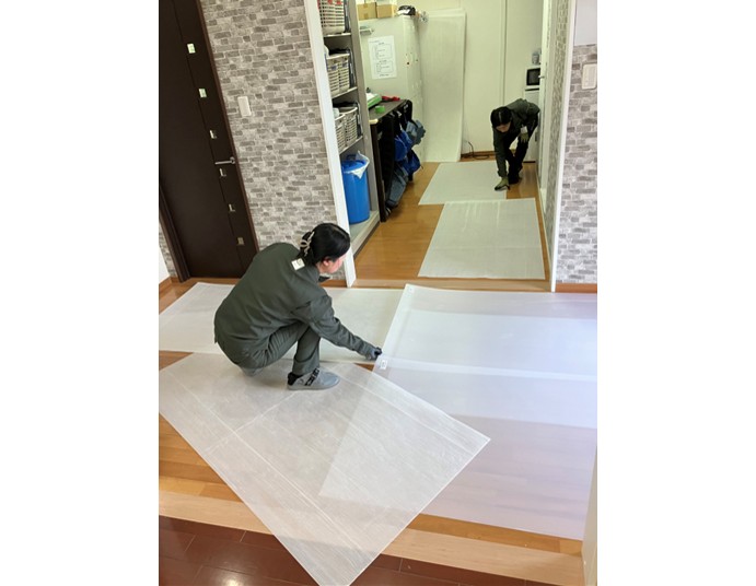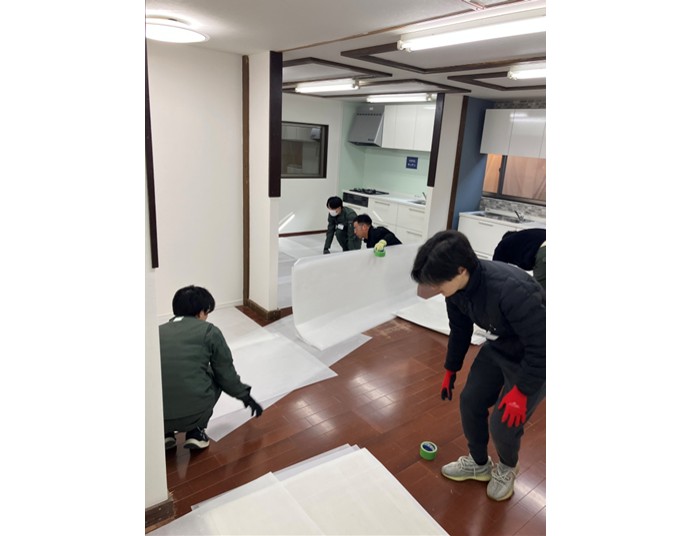 オリエンテーション後は床面の養生を行っていきます。