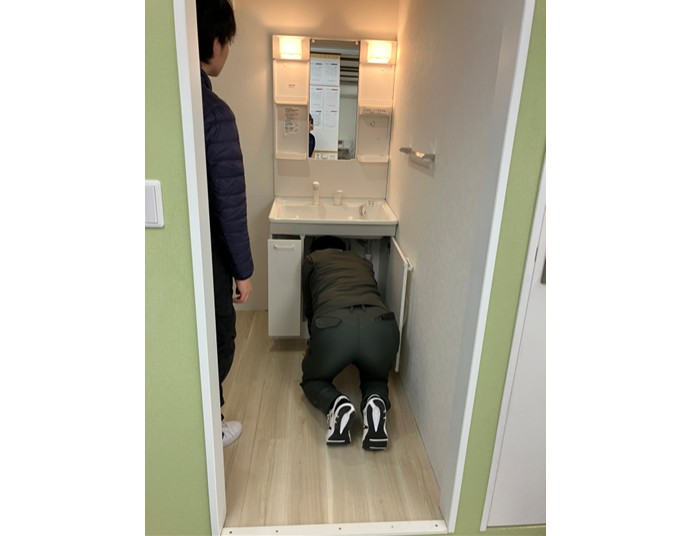 次は洗面台の解体と取付施工を学んでいきます。主に入居中のお客様対応の際に水漏れしているケースが多いのですが、シールが劣化しているのか、ホースを取り換えなければならないのか等の判断材料にもなりますし、リノベーションやリフォーム後に不具合があった場合は組み立て方を知っていればその場で修理できるというメリットもあります。