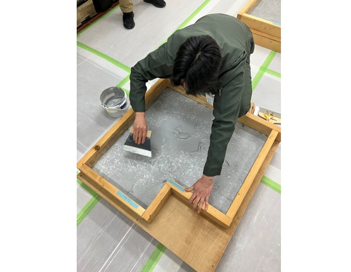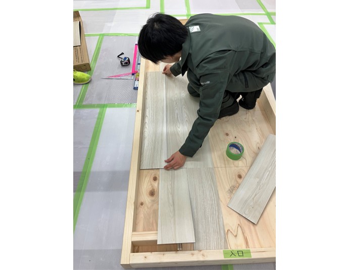 研修現場を実際の施工現場だと仮定し、発泡ポリエチレン製の板を張り合わせていく作業を行います。