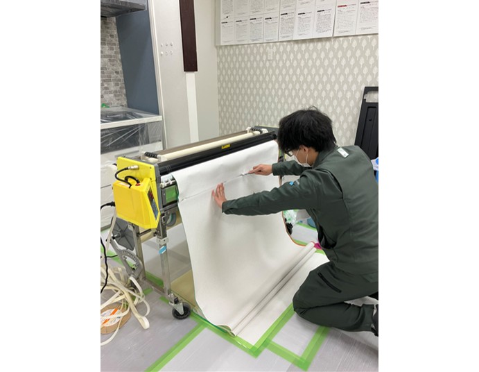 リフォームやリノベーションを発注する際は必ずと言っていいほど必要となる施工です。まずは材料を広げ施工箇所に必要な幅を大まかに採寸していきます。柄がついているものは向きや継ぎ目を必ず事前に確認します。