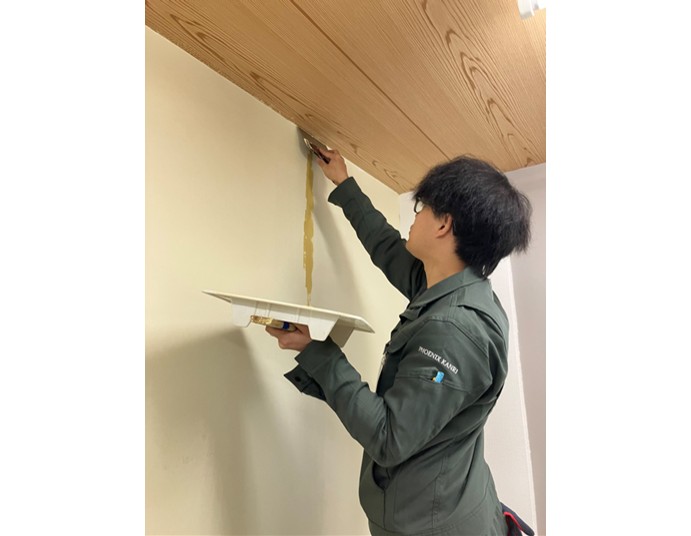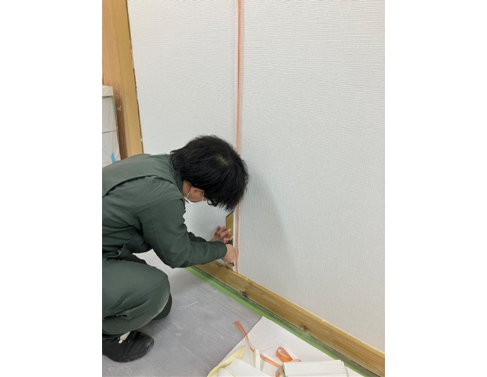 まずは室内のクロスを全てはがす作業からです。研修場なので前回クロスを貼ってからあまり時間が経っていないため、比較的綺麗にはがせますが、実際の現場では10年以上と入居年数が長い場合もあるため、はがしにくい現場もあるようです。はがした後はパテを作り、壁に塗っていきます。
