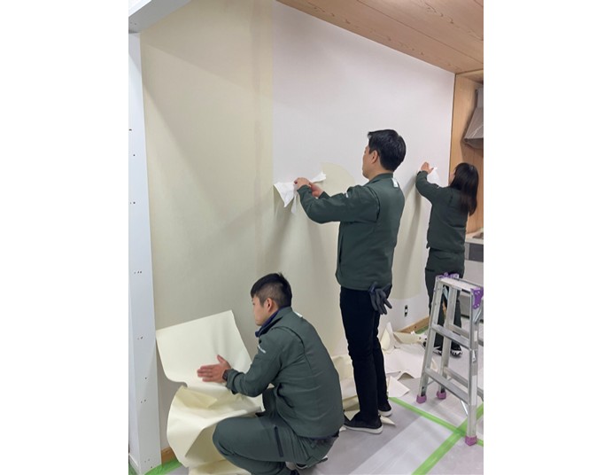 いざ壁紙を貼っていきます!みんな本物の職人さんみたいでかっこいいです!!